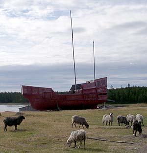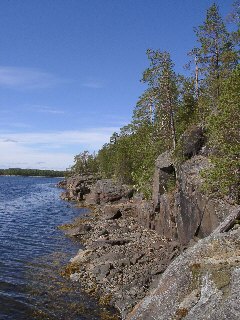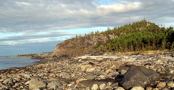 Вышли в 11.25. Сплавали за водой к ручью и устремились вдоль унылого берега к еще более унылому мысу Красный. Дошли до него за 1.5 часа. К этому времени небо заголубело. Пик прилива уже позади, но воды еще хватает, да и волна несильная. Так что мелкий пролив между мысом и большущим островом Кемь-Луда (кеми по-фински: "берег, обрывающийся в воду") прошли благополучно. Когда же мы выбрались из прилегающей системы рифов и повернули на ЮЗ к о. Песчаный (до него 4 км), волна резко усилилась. По категоричному требованию Астролога (звезды требуют) отвернули к берегу и вскоре причалили метров за 300-400 до горы Шавруха (42 метра), дабы дождаться вечернего штиля или хотя бы ослабления ветра.
