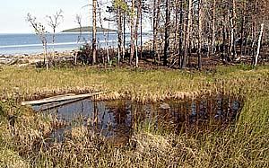 Стоянка на Сампо пуста. Народ, в целом, поначалу отнесся к этому месту скептически (да и что это за переход – 5 км!), но Кап.Н, борзо обежавший остров, заявил, что Адмирал был прав, и ничего подобного (в смысле возможностей фотосьемки) он, Кап.Н, раньше здесь не видел. Тут из-за облаков показалось солнце, и стоянка стала выглядеть намного привлекательней (не говоря о том, что вблизи Зампо обнаружил большую "ванну" с пресной водой). Остров, действительно, примечателен. При длине менее километра он включает самые различные ландшафты: с севера крутые, высокие, но гладкие разноцветные скалы с тундровой растительностью (в локальных ложбинах – морошковые болотца), на восточном мысу – хаос битых скал с миниатюрными ущельями, с юга – ровный уступ (2-3 м) скального берега с маленькими березовыми болотами, на западной оконечности – подкова галечного пляжа и массив низкорослого пышного сосняка. Есть тут черника и брусника, но сейчас их немного.