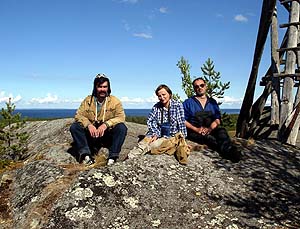 Познакомились с семьей (папа, мама, два сына) из Москвы, которая здесь проводит вот которое уж лето, начиная с 1986 г. Сами построили 2 избушки – на Кузокотке и в нашем заливе близ устья ручья. Сюда забрасываются (и выезжают) по лесовозной дороге от Чупы, которая проходит в 400 м от одной из избушек. С собой привозят самоделку-двушку и малую надувную лодку. Еще пользуются деревянной лодкой, что лежит на нашей стоянке (мы им ее и помогали спускать и вытаскивать). Эта лодка принадлежала как раз тому самому Николаю Михайловичу Елманову, которого жители Пояконды за страсть к странствиям прозвали Магеланом (через одно л). Он, бывший фронтовик, потом дозиметрист, а после Чернобыля – борец за экологию, наезжал сюда в течение многих лет. Стол и лабаз сделаны им же. Умер он в 1991 г., после чего на скале близ его стоянки и появилась надпись "Остров Магелана".