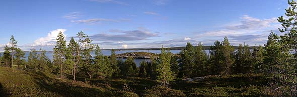 6 августа. Встали в 9, выплыли в 11.25. Опять палит солнце. Утренний штиль сменился ветерком в левую скулу. Идем к м. Кузокоцкий меж островов. Постоянных поселений здесь (как, практически, на всем маршруте) никогда не было. Документы (начиная с XVI в.) называют лишь Тоню Кузокотку и варницы на Кузокотке. Сам же мыс (поросший соснами) получил свое название от имени 600-м перешейка, соединяющего его с материком. По-саамски кузз-куоцка означает "еловый перешеек". Там, действительно, растут ели.