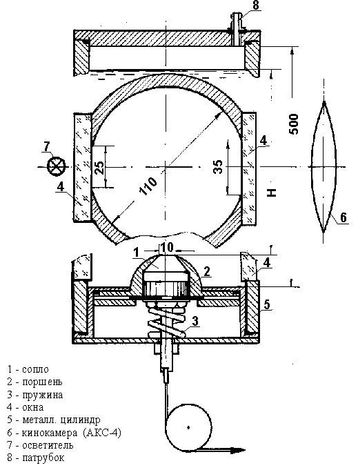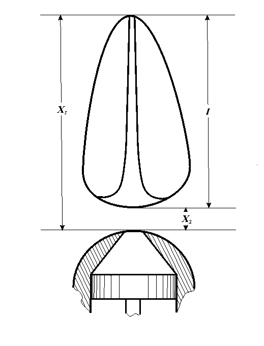 На рис. изображена устойчивая форма кавитационного пузыря, всплывающего в тяжелой жидкости. Измерялись координаты и скорости вершины (V1) и тыльной поверхности пузыря (V2). Эти данные представлены в таблице. Измерить на фотографиях диаметр струи не удается, т.к. преломление световых лучей пузыря приводит к искажению размеров струи и предметов, находящихся за пузырем. Внешние контуры самого пузыря на фоне освещенного окна не искажены.