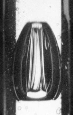 Представим условия и результаты одного опыта. Глицерин (плотность 1,26 г/см3; вязкость 20 г/см·с) заполнял трубу до уровня 15 см над соплом. Струя диаметром 1 см и длиной 2,5 см выстреливалась со скоростью 4,5 м/с. Давление газа над поверхностью глицерина ~ 10-4 атм. Киносъемка производилась с частотой 100 кадр/с.