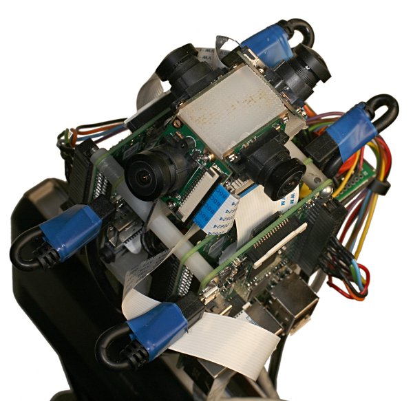 Используются 4 камеры, описанные в статье Picamera. Разброс между камерами даже одной партии довольно велик. Что не удивительно, поскольку смещение объектива относительно центра матрицы на 0,3 мм дает сдвиг в 10 градусов по углу зрения. Для максимального использования всей площади матрицы требуется довольно тонкая юстировка. Фокусировка и юстировка осуществляется по монитору, подключаемому к разъему HDMI последовательно каждой из камер. Можно контролировать картинку и на удаленном компьютере, но задержки делают эту процедуру менее комфортной.