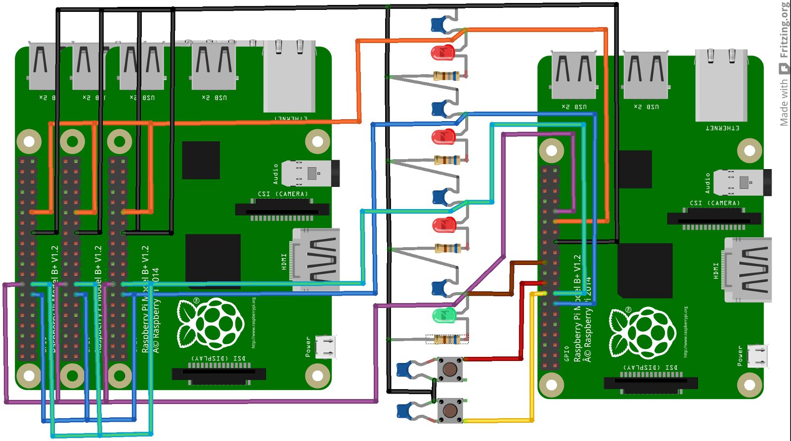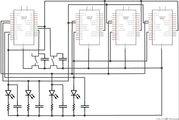 Если кубик один, то это кубик Рубика, другие кубики в единственном экземпляре интереса не представляют. Если кубиков несколько, то из них можно построить много разных конструкций. Имея четыре компьютера Raspberry Pi и четыре матрицы с объективами, можно построить панорамную камеру. Как говорил Лис, нет в мире совершенства, и у этой камеры в сравнении с построенными ранее будут свои плюсы и свои минусы. Чтобы не захлебнуться в потенциальном обилии возможностей и получить-таки работоспособный экземпляр, будем строго следовать принципу KISS (keep it simple, stupid). Берем четыре компьютера и пишем простейшую программу для осуществления синхронной съемки всеми камерами. Из принципа KISS следует, что в идеале программа для всех камер должна быть одинаковой. Например, 4 камеры с ИК приемниками запускаются с общего пульта дистанционного управления. Но, вынужден огорчить читателя, как и всякий нормальный герой, я пошел в обход, по одной простой причине - у меня не было четырех приемников ИК сигнала, а ехать их покупать было в лом. Хотя учитывая их копеечную стоимость, это было бы наверное самым правильным решением. Но мы идем другим путем. Один компьютер объявляется главным, а остальные 3 ведомыми. Устройство снабжается двумя кнопками, одна для выбора выдержки а вторая для старта процесса съемки. При нажатии на желтую кнопку последовательно перебираются выдержки от 1/20 с до 1/1700с + автомат. Выдержки индицируются в двоичном формате 3мя светодиодами. Соответственно все диоды потушены - автомат, первый горит - 1/20 с , второй - 1/50 с, первый и второй горят - 1/100 с . Третий - 1/200 с, Третий и первый - 1/400 с. Третий и второй - 1/800 с. Первый, второй и третий - 1/1700 с. При нажатии на красную кнопку стартует режим предварительного просмотра и загорается 4 светодиод. Он горит 5 секунд и в момент его выключения все 4 компьютера делают снимок. Пять секунд задержки выбраны для того, чтобы можно было отойти достаточно далеко от камеры и не маячить на переднем плане. Хотя процедура была организована максимально симметрично (главный компьютер подает команду и затем, как и остальные, считывает команду с отдельного контакта и запускает процесс), тем не менее главный компьютер опережал остальные. Пришлось вводить задержку через параметр bouncetime. На следующем снимке внешний вид камеры без корпуса - сейчас голый конструктивизм еще в моде, но в будущем я собираюсь сделать защитный корпус. Без корпуса вес камеры примерно 300 г.
