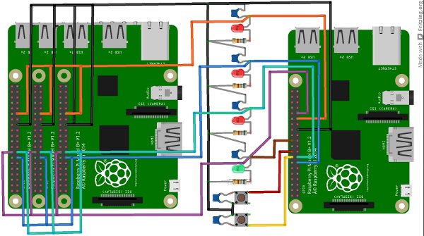 Ниже приведена электрическая схема связи компьютеров через GPIO. Обращаю внимание на конденсоры в 100 нФ. Они жизненно необходимы, без них с ложными срабатываниями никакими программными средствами мне справиться не удалось.