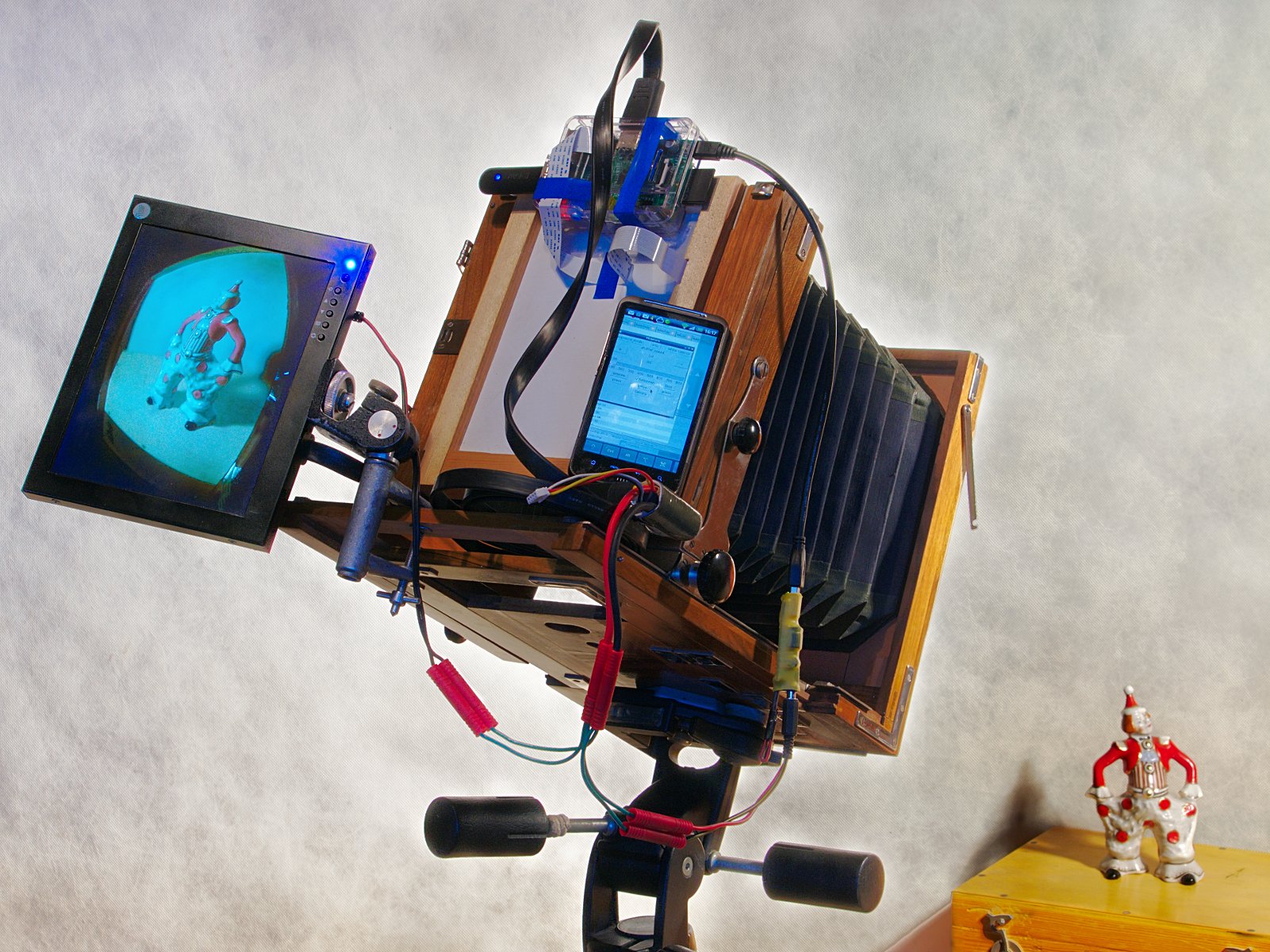 На снимке камера в рабочем состоянии. Монитор, подключенный через HDMI, используется только для полноэкранного просмотра. Пультом дистанционного управления является телефон. На фотографии он лежит на камере, однако при работе он естественно находится в руках у фотографа. Питание монитора и компьютера осуществляется от литий полимерного аккумулятора (LI-PO) 3 Cell 11.1 В емкостью 3000 мАчас. Монитор питается напрямую, компьютер через преобразователь, дающий на выходе 3,5 В. Для контроля разряда в цепь включен светодиодный и звуковой индикатор заряда. Емкости хватает на более чем час непрерывной работы. Я слабо себе представляю необходимость работать с этой камерой вне павильона, а в этом случае ее можно слегка запитать от сети.