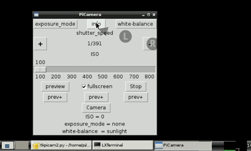 Для удобства работы с командной строкой можно сделать некий графический интерфейс. Его можно запускать, как на удаленном компьютере, так и если установить VNC, то можно получить удаленный доступ к рабочему столу и соответственно запускать его на Raspberry Pi. Есть уже готовые решения: Pi Vision и RaspiCam Remote. Другой штатный способ управления камерой это python, для которого существует специальная библиотека picamera. Для меня главное это повторяемость результатов, т.е. от программы мне в первую очередь требуется возможность задать выдержку и чувствительность. Поскольку готового решения мне сразу не попалось, то я написал свое. (Вариант Pi Sight меня не устроил.) Подробнее программу я планирую рассмотреть в отдельной статье, а пока для желающих покопаться привожу исходный текст для Python 2.7.3 и picamera 1.8.
