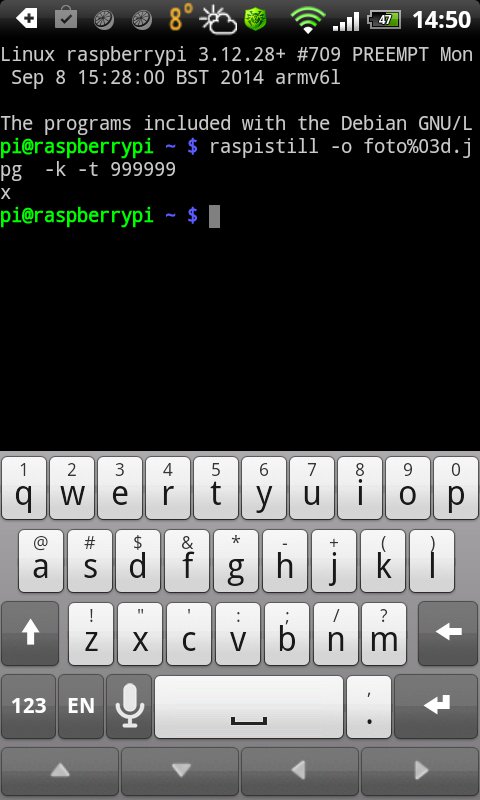 pi@raspberrypi ~ $ raspistill -o foto%03d.jpg -k -v -t 999999