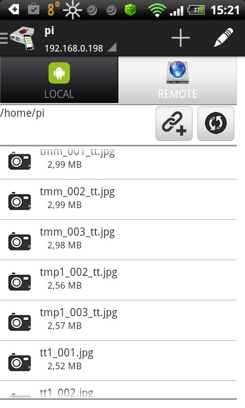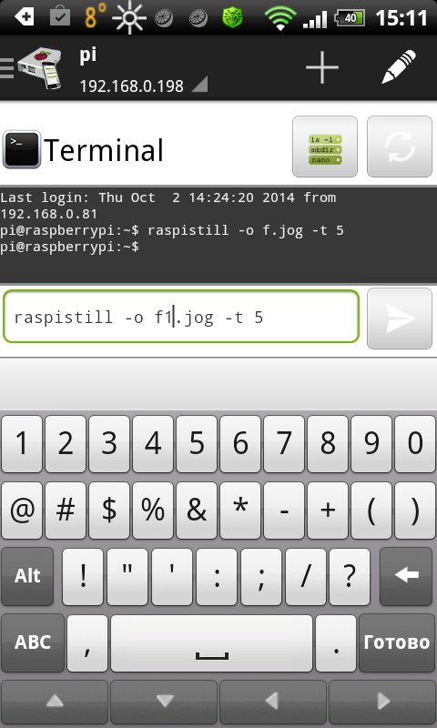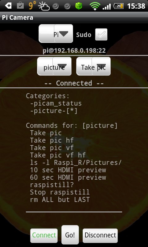 На телефоне с Android надо установить какой-нибудь SSH Client. У меня установлен JuiceSSH. Это общее решение аналогичное по стилю и возможностям с работой с большого компьютера. Есть и множество программ, заточенных именно под работу с Raspberry Pi. Я попробовал работать с Raspi-R и RaspControl. Хотя в первой уже есть предустановки для работы с камерой, мне вариант с составлением собственного списка команд, который предлагается во второй, понравился больше.