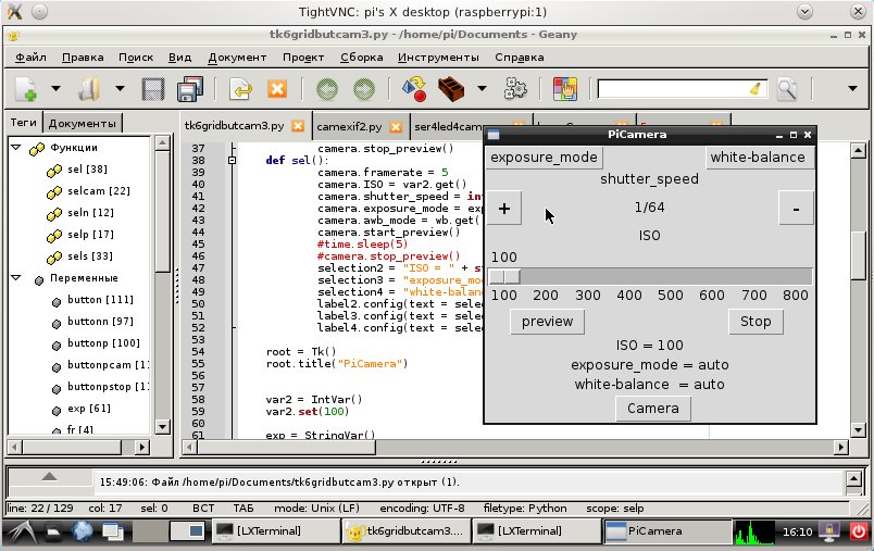 В если отвлечься от индивидуальных пристрастий к удобству интерфейса, то для сетевых подключений уже написано достаточно программ, чтобы реализовать любой вид съемки. При работе с ноутбуком tightvnc, на мой взгляд, вполне комфортно позволяет работать с программой управления камерой запущенной на Raspberry Pi. Если необходима живая картинка именно на нем , то, возможно, стоит написать некий интерфейс к командам, отправляемым через SSH для удобства переключения между режимом потокового видео для просмотра и режимом съемки фотографий. В этом случае особых преимуществ в использовании python я не вижу и можно ограничиться вызовом raspistill и raspivid.