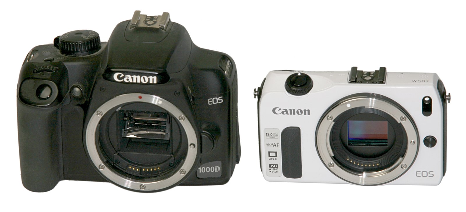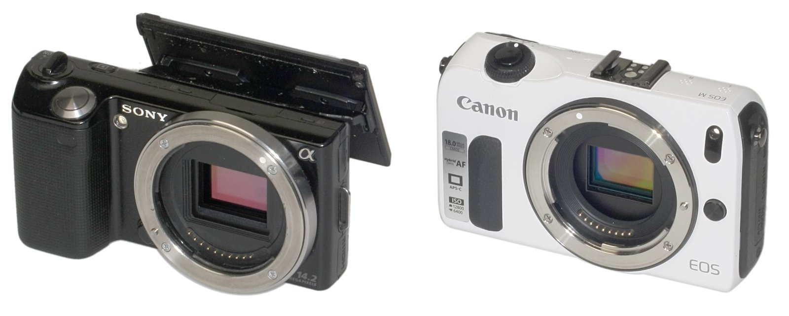 Фирма Canon выпустила собственную беззеркальную камеру со сменной оптикой последней из производителей зеркалок. Это 18 Мп камера с матрицей размером APS-C (22,3 x 14,9 мм). По своим характеристикам камера очень близка к зеркальной EOS 650. Однако при детальном рассмотрении создается впечатление, что фирма хотела продемонстрировать готовность производства к выпуску беззеркальных камер, но при этом не стремилась, чтобы их новая модель создала конкуренцию как собственным зеркальным камерам, так и беззеркальным камерам других производителей. По конструкции камера достаточно близка к Sony NEX 5: одинаковый рабочий отрезок 18 мм, близкий диаметр байонета.