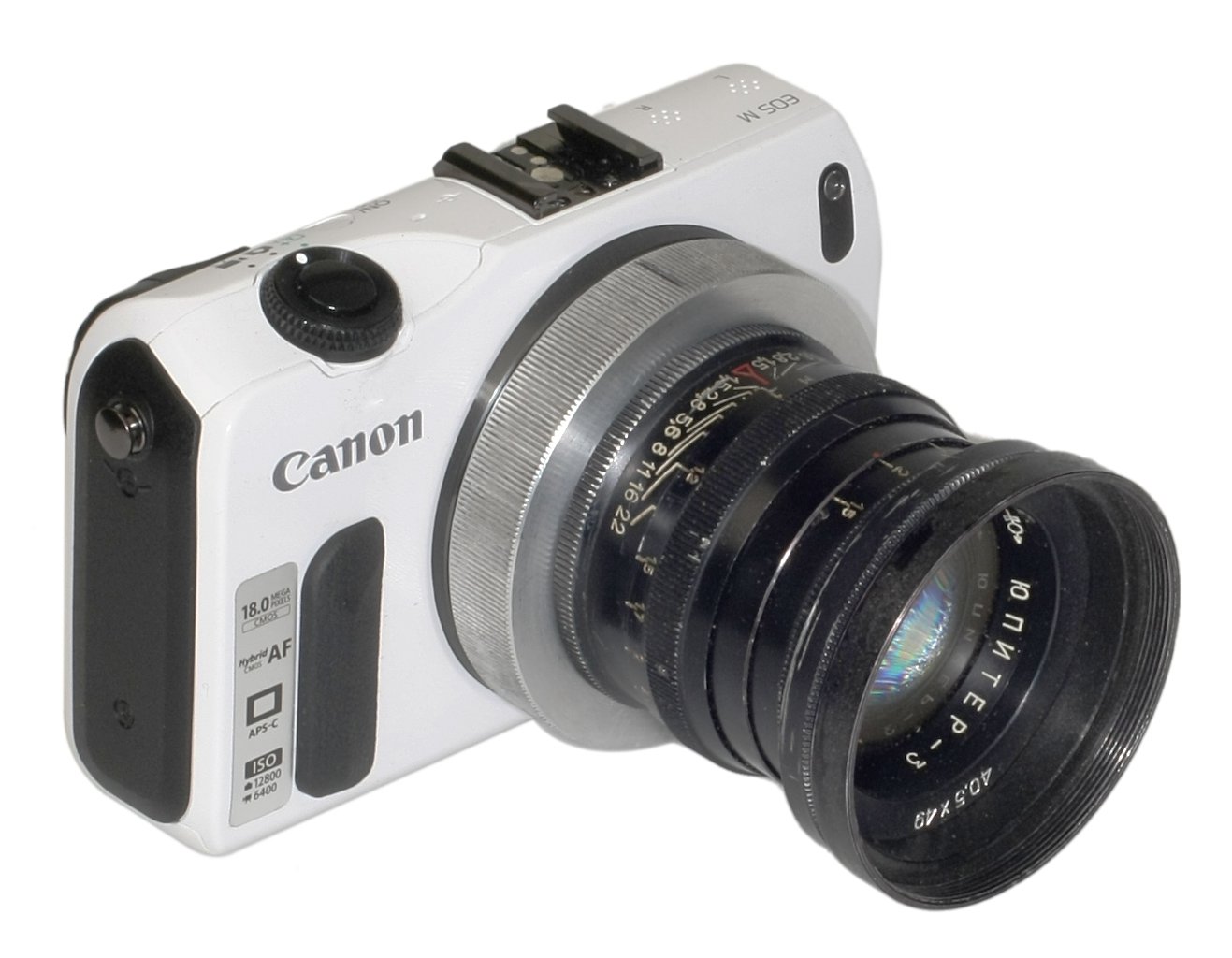 Фирма Canon выпустила для своей камеры переходник для использования объективов для зеркальных камер. У меня его не было, поэтому для дальнейшего тестирования был изготовлен чисто механический переходник с байонета EOS M на резьбу М39 с рабочим отрезком 28,8 мм.
