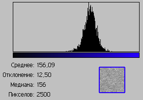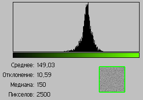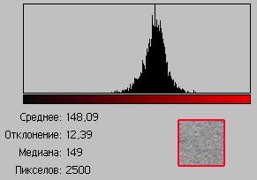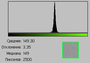 Чувствительность матрицы вполне соответствует спецификации, а вот с шумами ситуация очень интересная. Для оценки шумов был снят кусок молочного стекла. Выбран квадратик размером 50х50 пикселей, и анализировалось распределение точек по яркости. В каждом из каналов распределение шумов вполне приемлемое, однако меняются они в противофазе, поэтому результирующее изображение смотрится не как серое поле, а как пестрый набор разноцветных точек.