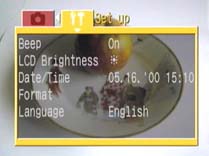 В каждом из режимов на экране появляется собственное меню. Первый съемочный режим полностью автоматический. Во втором съемочном режиме появляются символы настроек камеры и возможность регулировать экспокоррекцию и баланс белого. В третьем режиме есть возможность выбора программы съемки по символам. Программа Ландшафт, в котором аппарат фокусируется на бесконечность и выключается вспышка. Программа Спорт, при котором полностью открывается диафрагма и устанавливается максимально короткая выдержка. Программа Длительные выдержки, при которых устанавливается минимальная диафрагма, а выдержка может достигать двух секунд. Программа Ночная сцена использует маленькие скорости затвора и вспышку для подсветки переднего плана. Программа Черно-белой съемки. Еще один поворот колеса, - и мы попадает в режим панорамы. Меню у камеры достаточно удобное, причем в отличие от камеры А50, теперь есть возможность подключить телевизор и наблюдать на нем изображение и меню не только при воспроизведении, но и при съемке.