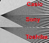 испытаний Камеры показали очень близкие результаты, как по разрешению, так и по спектральным характеристикам. Впрочем, можно отметить, что изображение, получаемое камерой Casio, несколько мягче остальных, а у камеры Sony при максимальных разрешениях ограничение наступает не из-за того, что яркость светлых и темных полос становится одинаковой, а из-за ярко выраженного муара.