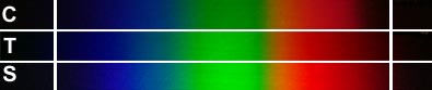 На фотографии спектра от дифракционной решетки белыми вертикальными линиями отмечена область, видимая моим глазом. Съемка производилась при близких значениях выдержки диафрагмы для всех трех камер. Учитывая, что чувствительность матрицы у камеры Sony больше, большим получился и спектральный охват.