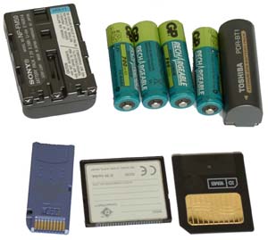 Аналогичная история и с аккумулятором. Casio использует 4 стандартных элемента питания размера АА, этот могут быть как Ni-Cd, так и Ni-MH аккумуляторы, или простые батарейки этого размера. Sony и Toshiba используют аккумуляторы собственной конструкции, причем, если ионные аккумуляторы NP-FM50 емкостью 1180 мА*ч достаточно доступны, поскольку используются видеокамерами Sony, то аккумуляторы от Toshiba не только самые маленькие по размеру, а значит, и с наименьшей емкостью, но еще и являются довольно большой экзотикой на просторах севера Евразии. Зарядным устройством для аккумуляторов, как у Toshiba, так и у Sony, является сама камера, которая подключается к сети переменного тока через блок питания. Он обеспечивает как зарядку аккумуляторов, так и питание от сети. Важным свойством, которое выделяет камеру Sony, является индикация оставшегося заряда в минутах.