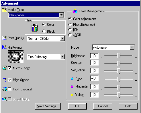 Драйвер принтера, к сожалению, англоязычный, имеет очень богатые установки пользователя. Он поддерживает ручную коррекцию цветов из драйвера, которая позволяет изменять яркость, контрастность, насыщенность изображения, а также вносить изменения в соотношение пурпурного, желтого и голубого красителей. Кроме того, можно использовать автоматические режимы согласования цветов: PhotoEnhance 3, ICM, sRGB.