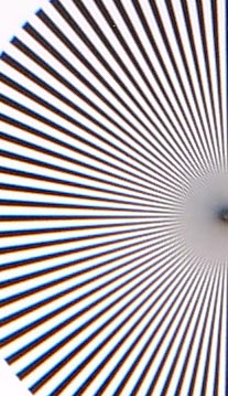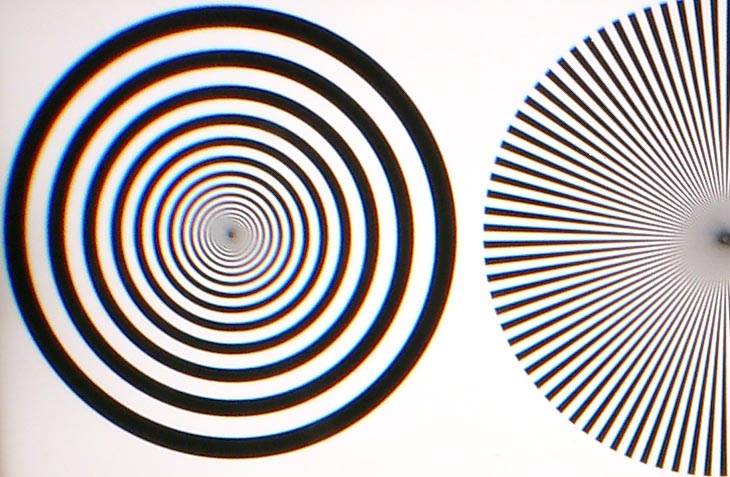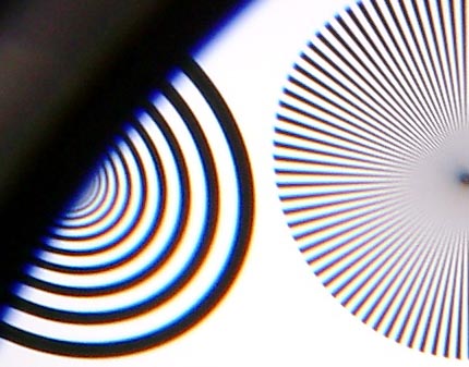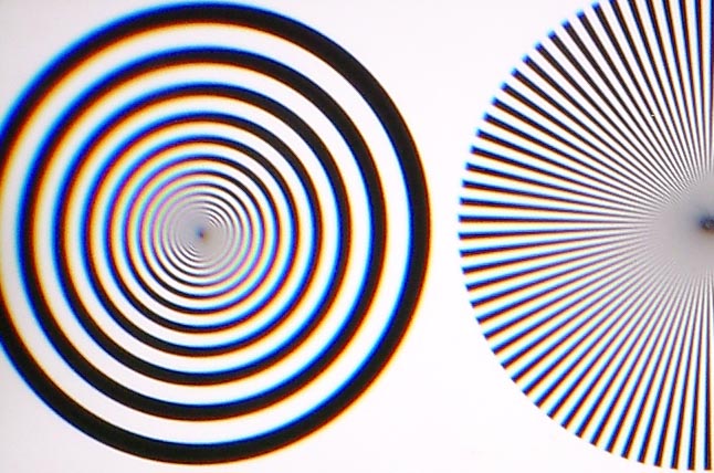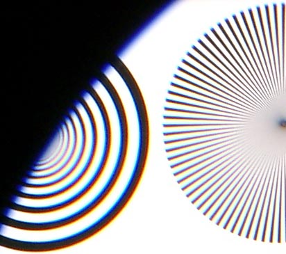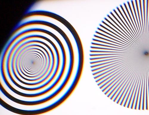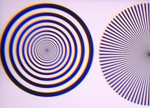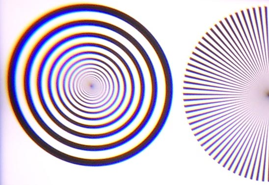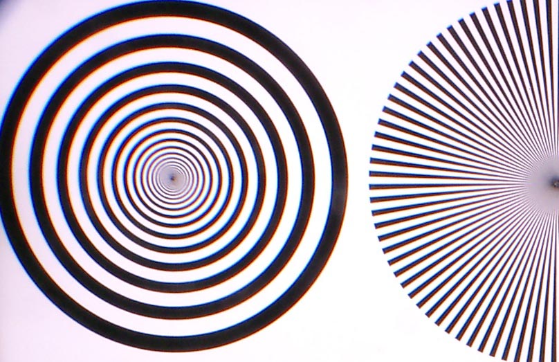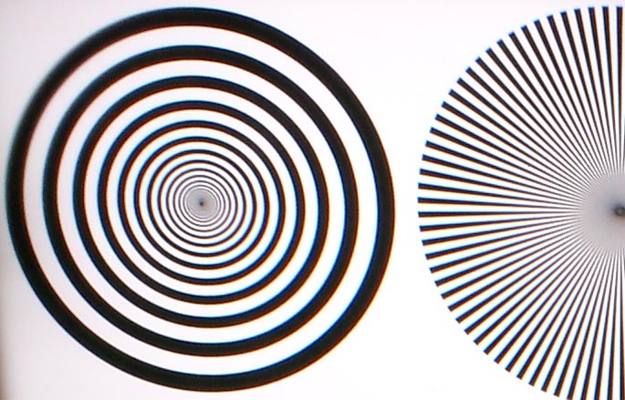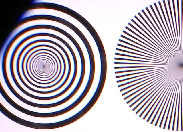 Для оценки качества производилась съемка камерой Casio QV 4000 радиальной и кольцевой мир, напечатанных на молочной пластиковой пленке Epson S041071, закрепленной на светостоле hama с цветовой температурой 8000 К. Яркости полос различались более, чем в 50 раз. Баланс белого устанавливался вручную. Фокусировка осуществлялась, когда мира располагалась в центре кадра, после чего камера поворачивалась таким образом, чтобы мира оказалась в углу кадра. Съемка проводилась при диафрагме f:8. Результаты съемки миры камерой без насадок можно посмотреть здесь. Снимки миры, расположенной по центру кадра, сделанные камерой с насадками и без насадок, почти не отличались, и в данной статье я анализирую только фотографии миры, расположенной вблизи от угла кадра. Радиус круга в пикселях, вне которого различимы все штрихи, обозначен буквой R. При наличии астигматизма круг вырождался в эллипс, в этом случае замерялись полуоси, лежащие в меридиональной (Rm) и в сагиттальной (Rs) плоскостях. Как видно из схемы, при фокусировке лучей, идущих в меридиональном сечении, кружок фокусировки превращается в линию, лежащую в сагиттальной плоскости, и, наоборот, при фокусировке лучей, идущих в сагиттальном сечении, кружок фокусировки превращается в линию, лежащую в меридиональной плоскости. Разрешение штрих на пиксель можно получить по следующей формуле: 180/6,28R. Черная и белая линии - 2 штриха.