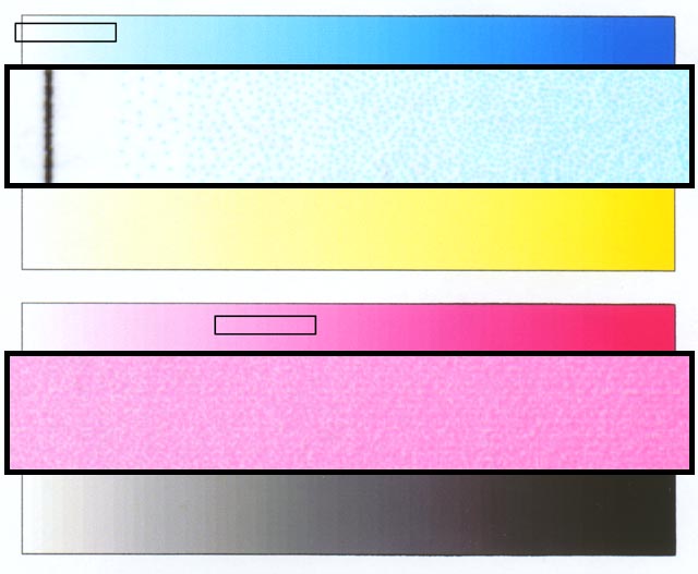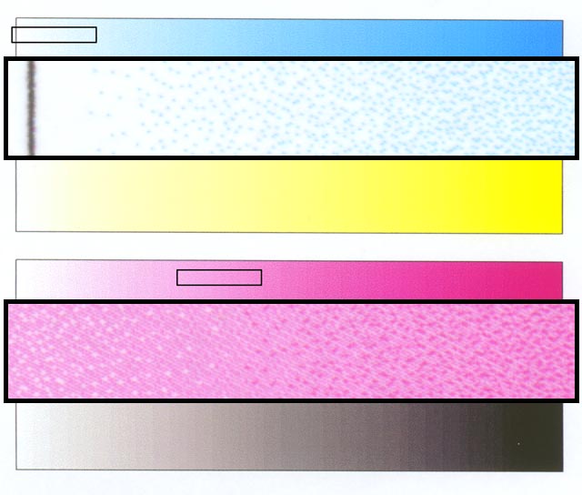 Для проверки возможностей передачи полутонов в программе Corel были нарисованы прямоугольники, закрашены в цвета чернил принтера с плавным увеличением интенсивности от 0 до максимальной. Как и ожидалось, результат сильно зависел от выбранной в драйвере печати бумаги, поскольку для каждого типа бумаги используется свой тип растрирования.
