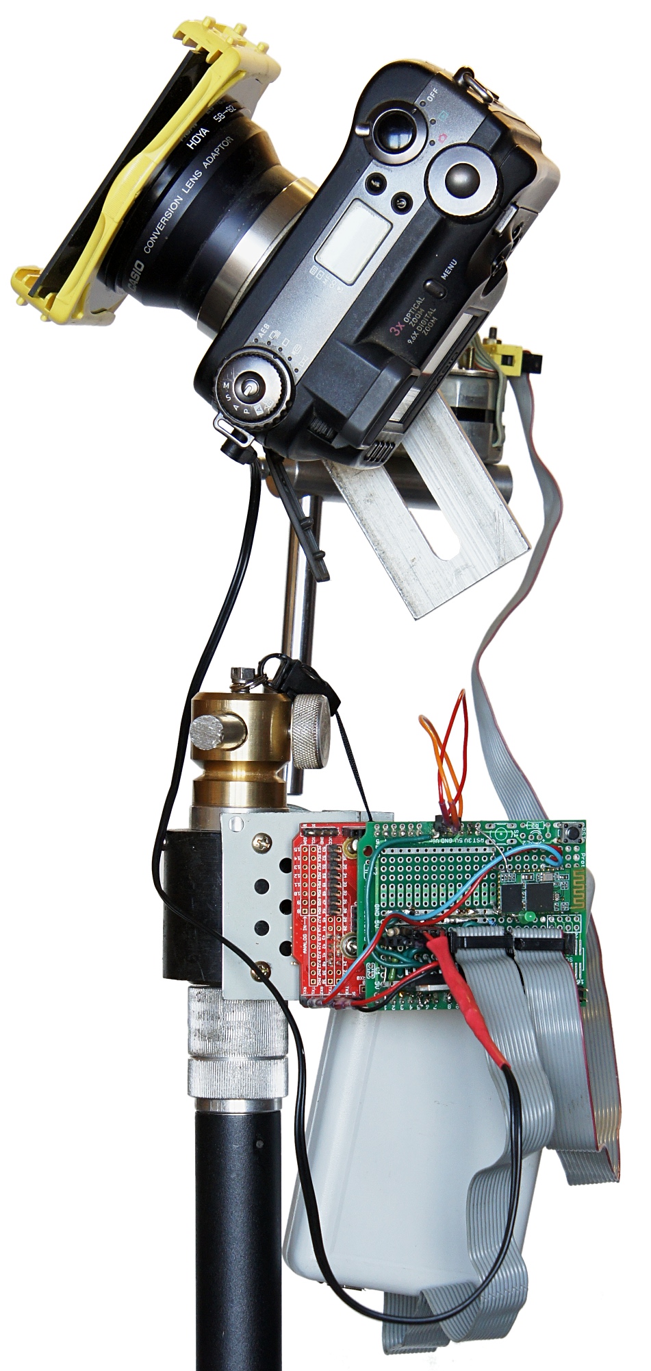 Как видно из приведенного снимка экрана, на всю программу было задействовано около 10% доступной памяти. Всю программу можно скачать здесь. Управление через Bluetooth полностью аналогично описанному в статье Управление съемкой с помощью телефона. Для работы программы необходима библиотека MeetAndroid версии от 8 декабря 2011 года, причем в файле MeetAndroid.cpp надо заменить Serial на Serial1. В программе сохранен модуль управления камерой Sony NEX по ИК каналу. Сигнал о спуске затвора подается одновременно на все подключенные камеры.
