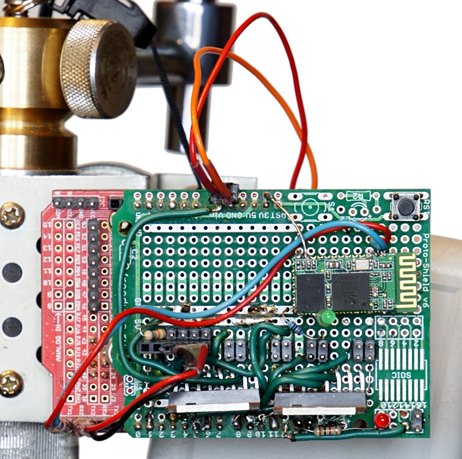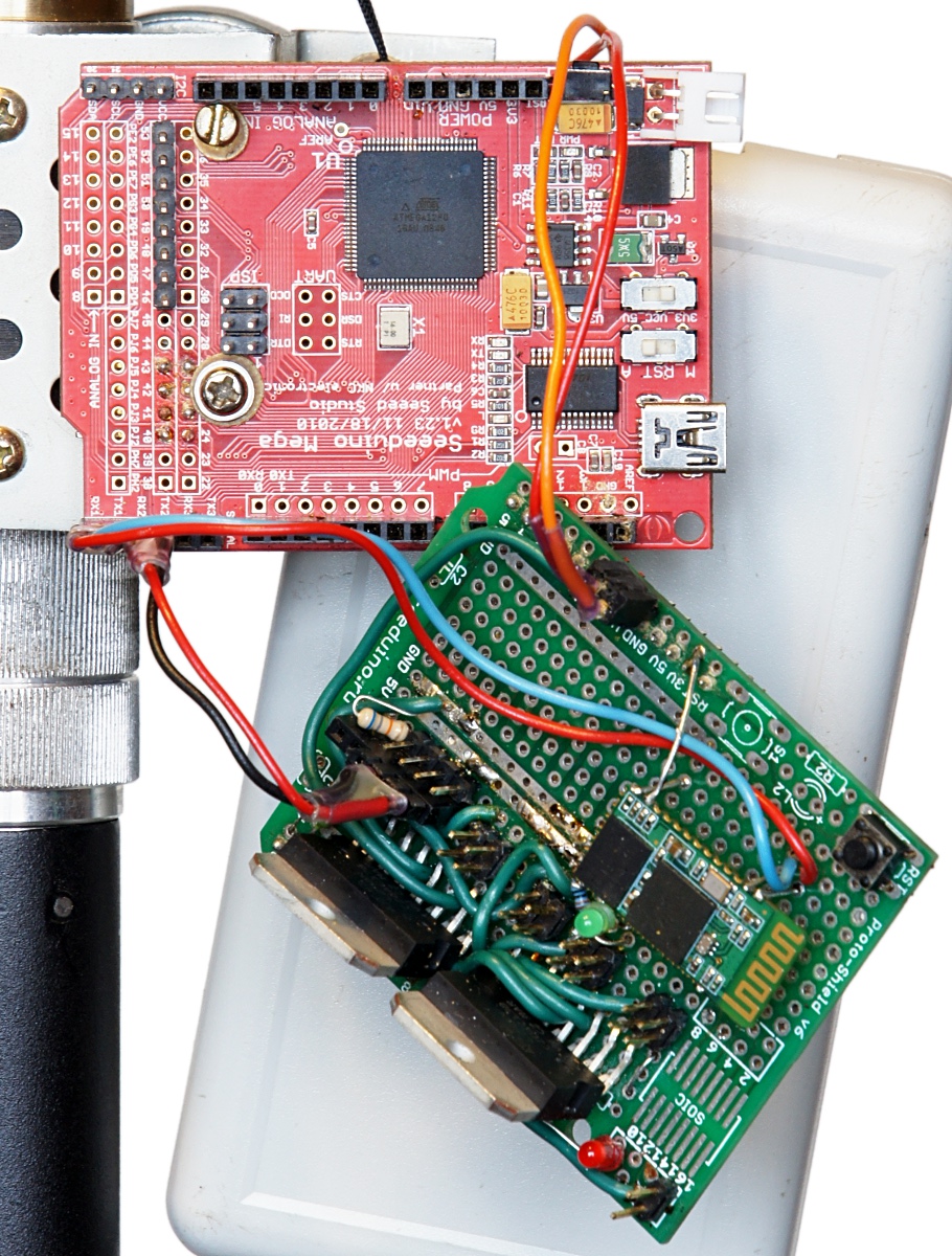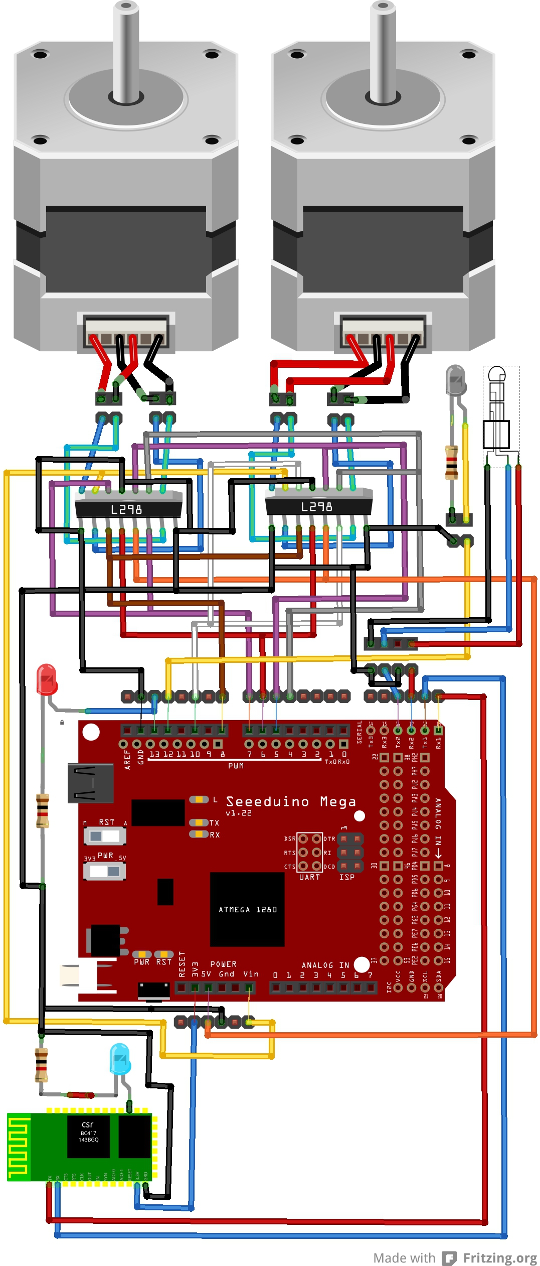 L298 представляет из себя четыре полумоста, объединённые по-два сигналами разрешения работы. Популярное описание принципов работы этой микросхемы можно найти здесь. Чтобы полностью использовать потенциальные возможности микросхемы, придется задействовать 6 цифровых выходов и два аналоговых входа платы микроконтроллера. Это очень расточительно, и обычно используются дополнительные логические микросхемы и связь через последовательный порт с микроконтроллером. Но выбранная мной для этой установки плата Seeeduino Mega имеет избыточное для этой задачи количество портов, да и все возможности L298 я использовать не планировал, поэтому пошел по пути максимального упрощения схемы и минимизации числа используемых деталей. Поскольку у микросхемы есть запас по току для моих двигателей, то мерить его я не собираюсь и замыкаю ножки SENA и SENB не через сопротивление, а прямо на землю. Естественно, аналоговые входы в этом случае тоже не используются. Используемая мной батарея питания не потянет одновременную работу двух двигателей, поэтому входы IN1-IN4 обеих микросхем подключаются параллельно. Я собираюсь использовать одновременно обе обмотки двигателя, поэтому соединяю входы разрешения работы (ENABLE), обозначенные на схеме как ENA и ENB. Таким образом, для управления двумя двигателями будет задействовано 6 цифровых выходов. Два для выбора двигателя и 4 для управления. Т.е. можно было бы обойтись и Freeduino Nano v5. Но с точки зрения простоты реализации у Seeeduino Mega есть несколько плюсов: три дополнительных аппаратных последовательных порта, что позволяет легко реализовать одновременную работу по связи с компьютером, связи по Bluetooth и управление камерой Casio. Кроме того, есть переключатель напряжения логики в режим 3 В, что позволяет упростить схему подключения модуля Bluetooth.