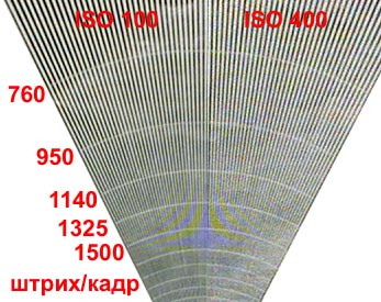 Для оценки разрешения снималась радиальная мира. Разрешение оценивалось в числе линий (белый штрих и черный штрих – это два штриха) на кадр. Ясно, что в идеальном случае, когда штрих сфокусирован точно на чувствительный элемент, разрешение совпадет с числом пикселей, а если линия сфокусирована точно на промежуток между чувствительными элементами, то различить не удастся ни одной линии. Поскольку чувствительные элементы в матрице расположены в виде параллельных рядов, а штрихи в мире расположены под углом к этим рядам, то на снимке мы имеем чередование строк с максимальным и минимальным разрешением, что на фотографии выглядит как муар. За разрешение матрицы я принимаю строку с максимальным количеством различимых точек. |