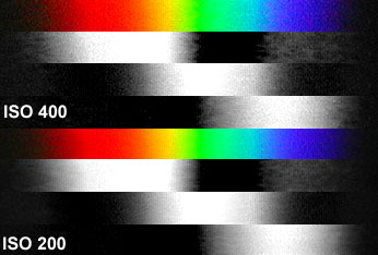 Для оценки спектральных характеристик матрицы снималось изображение спектра, полученное на экране с помощью дифракционной решетки. Результат считался приемлемым, если в каждом из каналов присутствовал только один монотонный максимум.У данной камеры наблюдается второй слабый максимум в синей области для красного канала. Взаимное влияние каналов возрастает с увеличением чувствительности. При ISO 100 паразитный максимум практически не заметен. Возможно, эффект связан не с матрицей, а с алгоритмом баланса белого. Преимущество съемки спектра от решетки или призмы по сравнению с цветной тест-таблицей состоит в том, что в снимаемом изображении присутствуют все длины волн, в отличие от типографского или фото отпечатка, где весь диапазон цветов достигается смешением света с дискретным значением длин волн. В предельном случае, если красители отпечатка имеют очень узкий спектральный диапазон пропускания, а камера - столь же узкие зональные фильтры перед матрицей, мы можем получить как великолепный результат при их совпадении, так и отвратный, если спектральные диапазоны смещены. При этом съемка пейзажа при солнечном освещении может дать прекрасную цветопередачу, а освещенная этим же светом тест-карта будет абсолютно черной.
