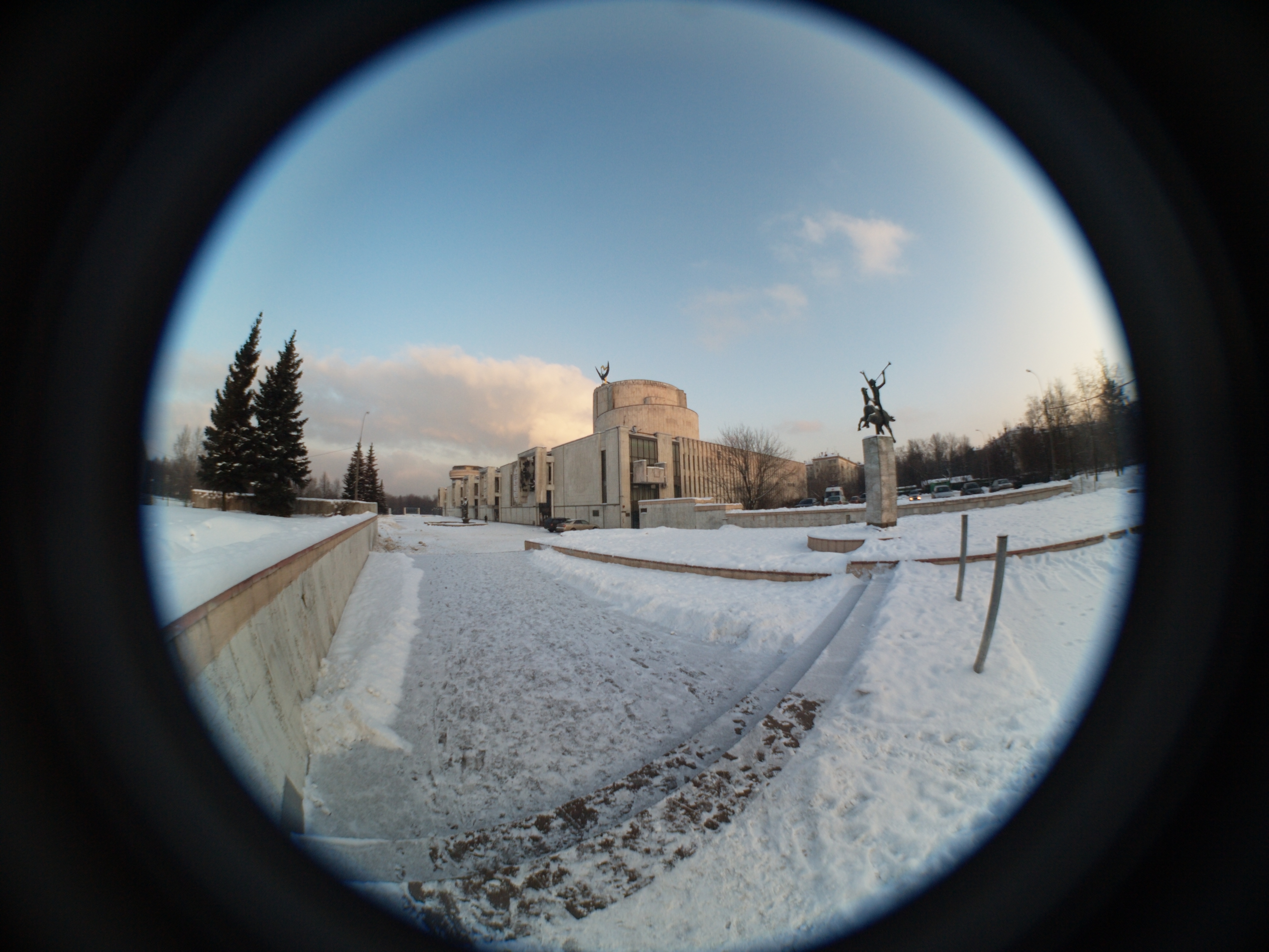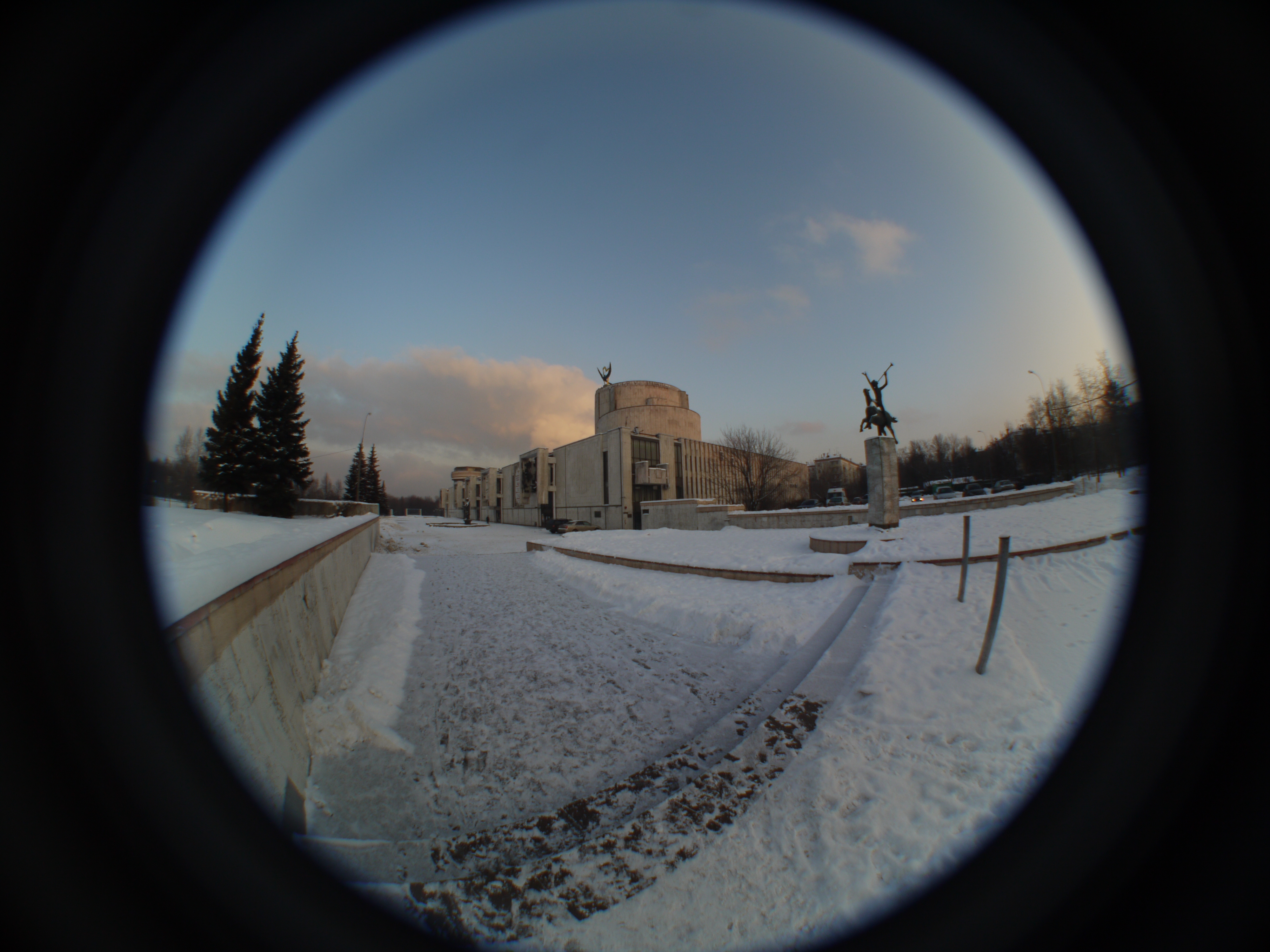 А если дополнить его линзой, использовавшейся для создания афокальной насадки в статье "Рыбьи глаза и компактные камеры", то можно получить и на данной маленькой матрице круг с охватом 180 градусов. При этом рабочий отрезок уменьшится примерно до 30 мм.