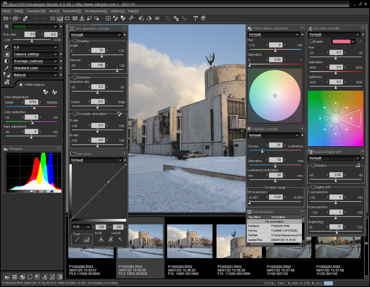 С камерой поставляются две программы: программа просмотра PHOTOfunSTUDIO и программа преобразования сырых кадров SILKYPIX Developer Studio 3.0 SE. Вторая имеет богатые возможности коррекции снимков, в том числе, и аберраций оптики, и может работать не только с сырыми файлами RW2, но и с форматом JPEG.