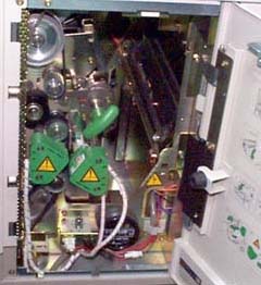 Внешний вид и внутреннее устройство сканера вы можете оценить по приведенным фотографиям, обилие внутри сканера деталей, выполненных на токарном станке, наводит на мысль о солидном военном производстве, а не о крупном ширпотребе. Главное требование к промышленному сканеру – это надежность, скорость и долгий ресурс работы. Рассматриваемый мной 500-й сканер давно находится в эксплуатации и уже не производится (сейчас выпускается 7500-ая модель, полностью совпадающая с ним по механике), но никаких видимых следов износа я не заметил. Каких-то принципиальных особенностей в оптической схеме сканера я не обнаружил. Лампа, несколько зеркал, объектив и ПЗС-линейка. Все это в двух экземплярах, так как сканирование производится с двух сторон одновременно. |
