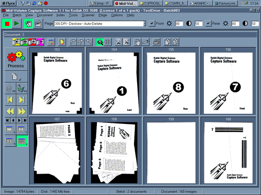 И далее, вы через минуту имеете отсканированную с двух сторон пачку из 80 листов, причем все изображения выровнены и занесены в базу, миниатюру которой можно просмотреть на экране. Вы можете попросить компьютер удалить изображения, не содержащие информации, можете повернуть изображение на 90 или на 180 градусов и запустить программу распознавания текста. Естественно, что высокая скорость определяется не только механикой сканера, но и возможностью передать изображение в компьютер. В рассматриваемом варианте изображения передавались как черно-белые в уже сжатом TIFF-формате. Соединяется сканер с компьютером через порт SCSI-2 , результаты сканирования могут обрабатываться специальной программой MVCS или передаваться через TWAIN интерфейс другим программам, установленным на компьютере.