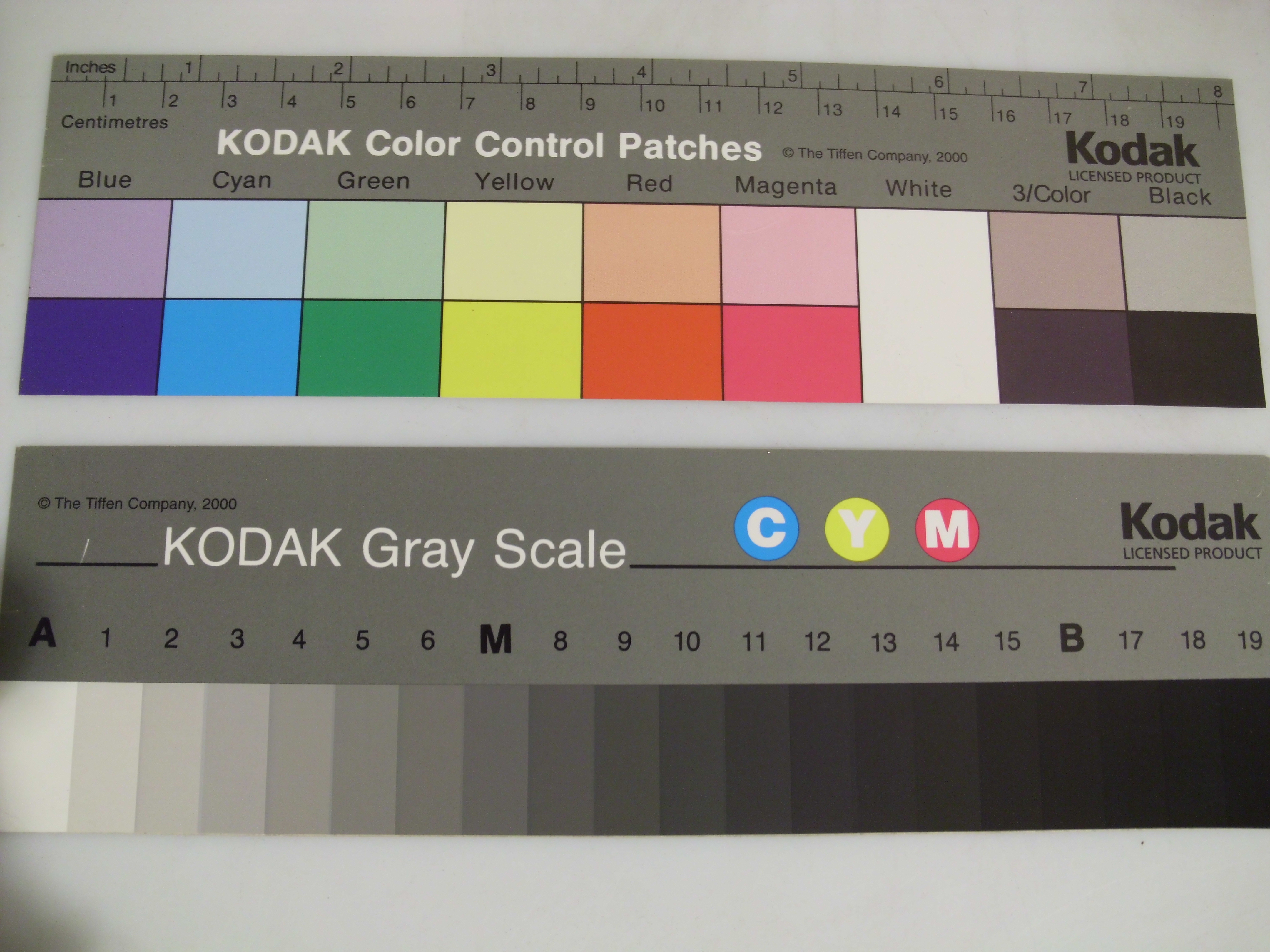 Ниже приведены спектры, измеренные спектрофотометром ColorMunki Photo с помощью программы Argyll Color Management System для тестовых полей отпечатка фотографии последней таблицы. Для сравнения пунктиром приведены спектры тестовой таблицы Kodak для серого поля и желтого и синего цветов, где разница в воспроизведении наиболее сильно бросается в глаза.