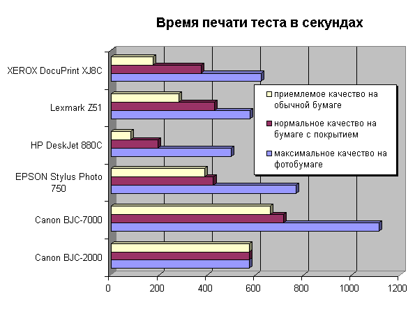 Следует заметить, что время печати зависит не только от принтера, но и от программы. При печати больших фотографий из программы PhotoShop принтер Canon BJC 7000 демонстрировал лучшие результаты, чем принтер Epson Stylus Photo 750. Подводя итоги теста на скорость, можно сказать, что если вам нужно отпечатать большое количество копий с приемлемым качеством на обычной бумаге, то лучший выбор - это принтер Hewlett Packard Desk Jet 880C. При печати с нормальным качеством на бумаге с покрытием лучшие результаты показал XeroxDocuPrint XJ8C, незначительно опередив Epson Stylus Photo 750 и Lexmark Z51. При печати с максимально возможным качеством лучший результат из многокрасочных принтеров показал Lexmark Z51.