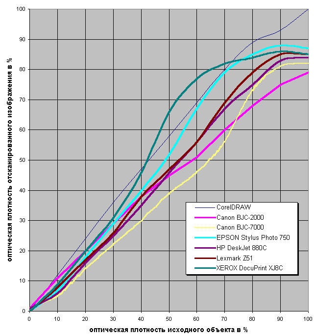 Из приведенных графиков видно, что наибольший динамический диапазон от 0 до 87% продемонстрировал принтер Epson Stylus Photo 750. Наилучшую линейность во всем диапазоне показал принтер Canon BJC 2000, правда, за счет наименьшего динамического диапазона. Хорошую линейность в диапазоне 0-90% продемонстрировали принтеры Hewlett Packard DeskJet 880C и Lexmark Z51. Лучшее воспроизведение деталей при плотности больше 70% показал принтер Canon BJC 7000. Фактически все принтеры, кроме Canon BJC 2000, не позволяют различать детали при плотности более 90%.