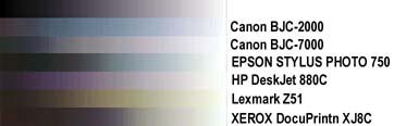 Оценивая цветовое смещение серой шкалы отмечу, что Canon BJC 2000 имеет небольшой голубой сдвиг, Hewlett Packard Desk Jet 880C - пурпурный, Lexmark Z51 - желтый, Epson Stylus Photo 750 – желто-зеленый при отдельных значениях плотности. Наилучшие результаты на глянцевой бумаге и пленке, на наш взгляд, показали принтеры Canon BJC 2000 (на глянцевой бумаге GP201) и принтер Xerox DocuPrint XJ8C (на пленке 003R93915).