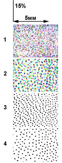 фотографии плавно изменяется прозрачность красителя в эмульсии, а при растровой